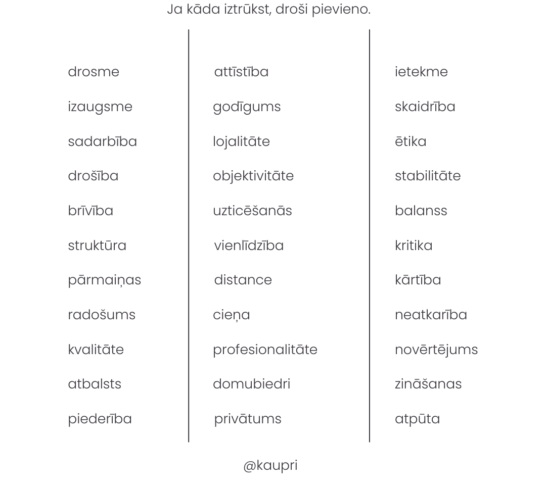 Izvēlies 10 vērtības un vajadzības, kuras Tev nepieciešamas grūtību pārvarēšanai. Ja kāda iztrūkst, droši pievieno.